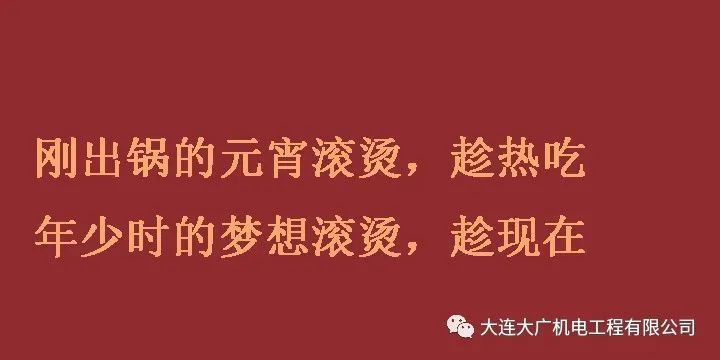 新年伊始,火力全开,在大广董事长的带领下,大广机电的小伙伴们都踏上了新的征程,一切将不同于过往,在新的一年里,向过去挥挥手道别,勇敢的向未来跑去,2021年我们一起携手共创佳绩!在此元宵佳节来临之际,祝大连大广机电工程有限公司全体员工及员工家属元宵节平安快乐,幸福健康!