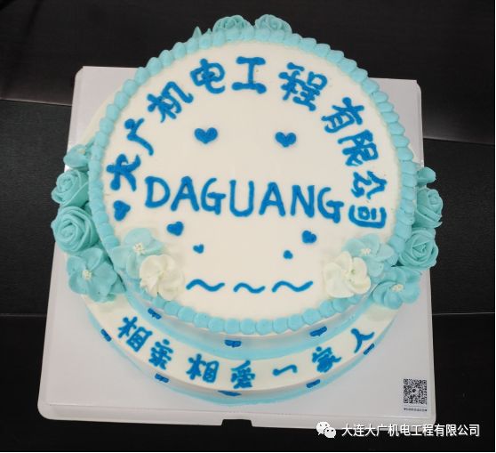 蛋糕以大连大广机电工程有限公司logo的蓝白色调为主色,大广之家,永远是相亲相爱的一家人。