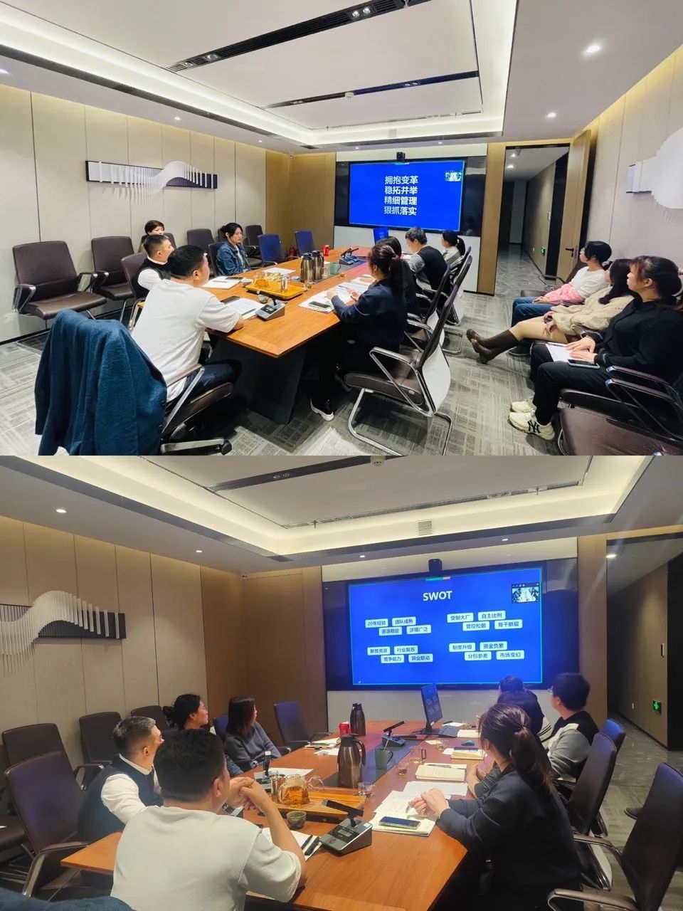 会议最后,公司总经理朱总作了主题为“拥抱变革 稳拓并举 精细管理 狠抓落实”的汇报。朱总从国内外经济现状与经济预测、行业市场政策分析与预判两大维度指出,2023年建筑行业将迎来全面的苏醒回暖,建筑上下游行业也一定会越好越好,我们今年也势必迎来机会拐点。同时,朱总针对公司近三年总完成产值、人均产值以及公司的SWOT做了客观全面的分析。面对已经到来的2023年,围绕公司的发展方向、管理方向、用人方向,分别作了更高级别的战略指示。
